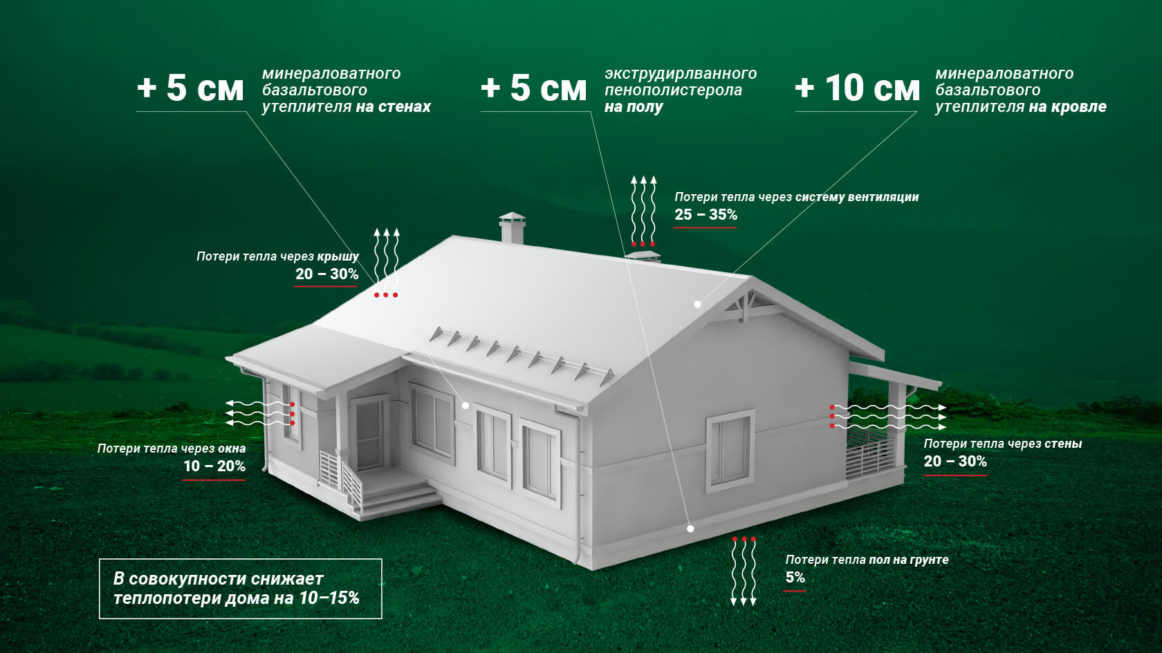 Снизив теплопотери дома за счёт дополнительного утепления и применения вентиляции 5 в 1 мы можем реализовать основную систему отопления, используя только низкотемпературные источники тепла (тёплые полы).